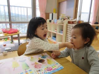 今年度も残り2日となりました。4月からはそれぞれのクラスへ進級するんですが、その練習として0歳児が1歳児クラスへ行って異年齢交流をしている場面です。