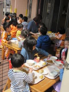 また、今日は天気も良かったので、テラスにて3歳以上児のクラスと一緒に2歳児さんも食べました。