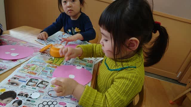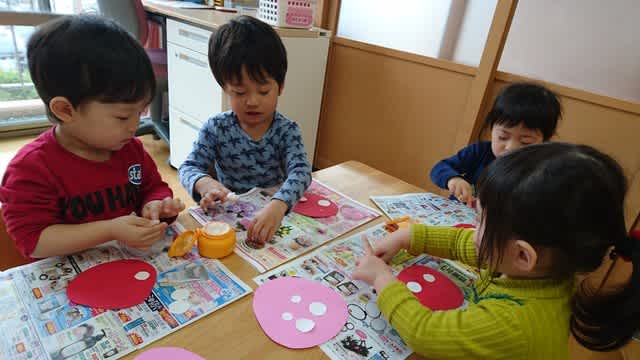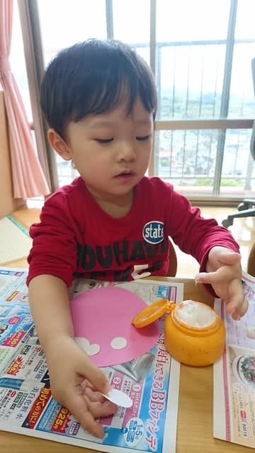 小さな 〇 へ のりをつけていきますが、ひんやりしてべたべたで・・いろんな感触を味わったようです(^.^)