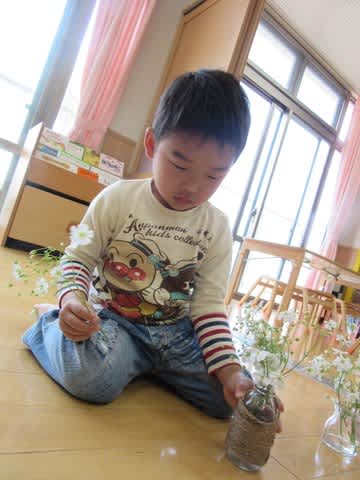 今日は朝から保育士の家に咲いていたたくさんのカスミソウを持ってきて、子どもたちと共に生けました