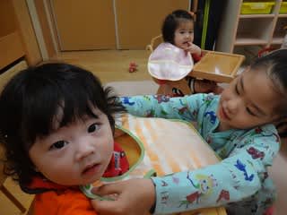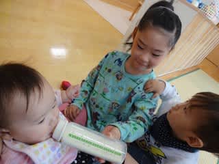 ちょうど0歳児さんは朝おやつの時間で、エプロンをつけてくれたりミルクを飲ませてくれたり・・・と大活躍!