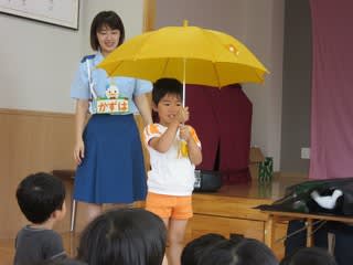 今日の交通教室は、傘のさしかた、レインコートの着かたのお勉強でした。