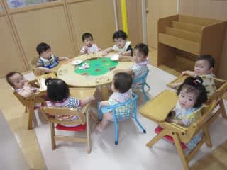 0歳児室の保育室楽しいおやつの時間です。