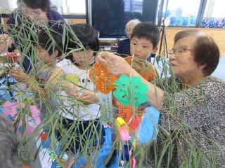 隣接のデイサービス宮の利用者様と共に4・5歳児の子が笹に飾りつけをすることを通して、世代間交流をしてきました。