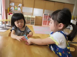 1歳児の真剣な顔。小さな手、指に全神経を注いでいます。 24日の英語であそぼうです。4歳児は第2回目で、とても意欲的です。次々と今まで耳にしなかった英語の単語が・・・ でも楽しい工夫が沢山してあって、どんどん吸収していま…