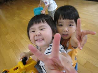 夕方、賑やかな声が保育室から聞こえています。 何だろう??? と覗きに行ったら・・・ 「じゃ~ん!」 手首には紙テープが巻かれてますね~ 僕たちも見て~(^^♪「ジャ~ン! de フライングゲット☆」 とポーズまで決め…