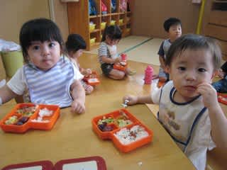 今日の昼食は・・・『バーガーパン!!』 3、4、5歳児さんは自分たちで重ねていきます(^^♪ 出来上がりはご覧のとおり(*^^)v美味しそう!! みんな大喜びでかぶりついていました(*^_^*) 何気ない工夫や見…