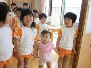 そこで、3歳児のお姉さんたちは考えて「お始まりの時間よ~」と優しく手をつないで一緒に並んでくれました(*^_^*)