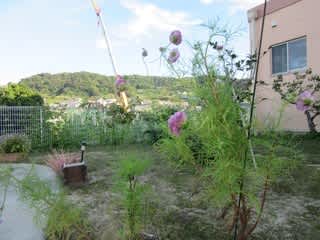 カメラマンの腕が悪く、見にくいでしょうが、園庭のプランターにコスモスの花が咲いています。