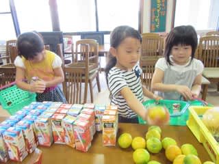 どれにしようかな~?それぞれ、お母さん気分になってジュースやみかん、ゼリーにまで手が伸びる子どもたち