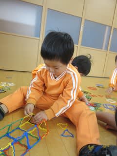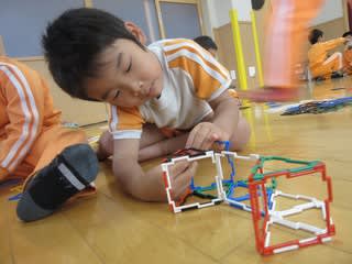 この玩具は、三角形や四角形、五角形や六角形を合わせながらいろいろなものを作っていくもの。