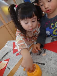 2歳児クラスを覗いてみると、色塗りをしていました。 数日前「雪ダルマ」に顔や手、模様を描いておいたので 今日は上から色を塗り、「はじき絵」をしました。 雪ダルマが消えてしまわないか心配の子ども達は「塗っていいと??」と何…