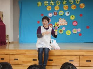 誕生者の紹介の後は、保育士による指人形を使ってメロンパンの歌を一緒に歌ったり、