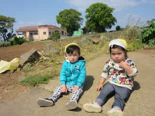 保育園の周辺の畑道を散策。ちょっぴり疲れたなあと休憩です。