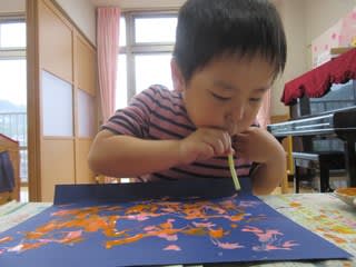 画用紙に絵の具を垂らし、ストローでふーっと息を吹きかけると・・・