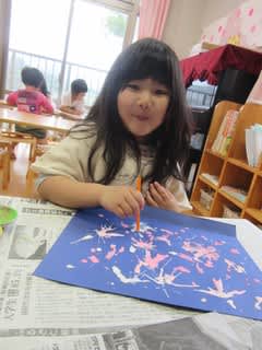 いろんな方向へ絵の具が伸びていって不思議な模様の出来上がり(^^)