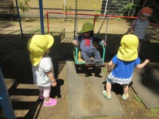 ホリデーの一コマです。ブランコに乗りたい1歳児さん。