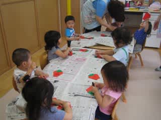 「お皿からはみ出さないようにいちごをのせてね」と保育士の言葉を