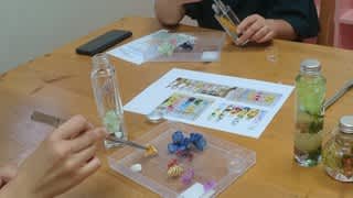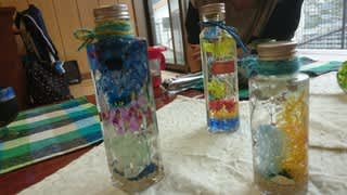 たくさんの材料を選ぶ時から会話もはじけて、イメージを膨らませながら瓶の中にそれぞれの世界観が広がって、素敵な作品が出来ました!