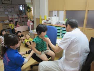 白衣姿の嘱託医の先生に泣いてしまうお友だちもいましたが、