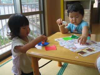 1歳児さんたちも、上手に色紙にスティックのりをつけていますね