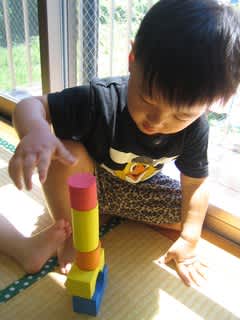 ふわふわの積み木を使って、そーっとそーっと…