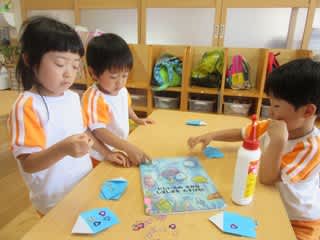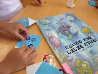 キラキラのうろこをつけて、みんなが大好きなにじいろのさかなを作っています。