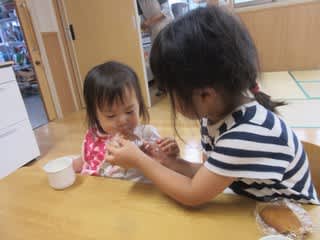 今日のホリデーは久しぶりの10人越え そこで、張り切った担当者たちはおやつを作ることにしました。 おやつ・・・といっても、簡単なゼリーなんです 「にいたん、上手」 カップを手に こぼさないように気をつけながら…