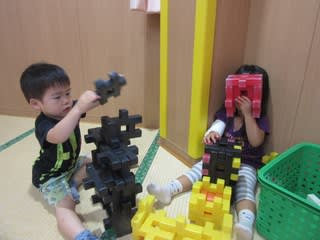 2歳児の保育室におじゃまするとブロック遊びの最中