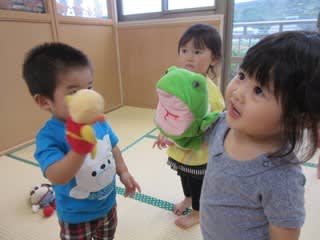 1歳児の保育室におじゃまするとお人形さんを使って何やら会話中(^^)