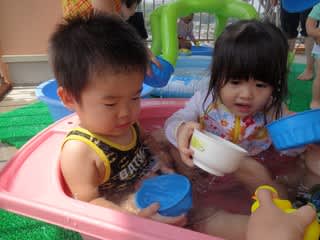 2.3・4・5歳児さんはテラスにて、0・1歳児さんは2階のベランダで水遊びをしました(*^^*)