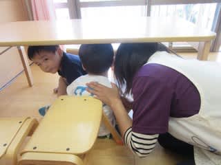 地震が発生したら頭や身を守るために机の下に入り揺れが治まるのを待ちます。