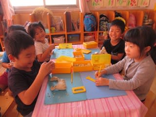 12月3日(土)はお遊戯会です。 子どもたちはその日に向けて練習を頑張っています と同時に、自分たちが使う道具や小物類もせいさく中 みんな自分たちが使用するものだけに、どういうものか理解し、 楽しみながらせいさくしている…