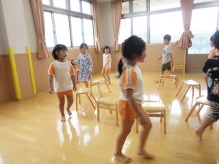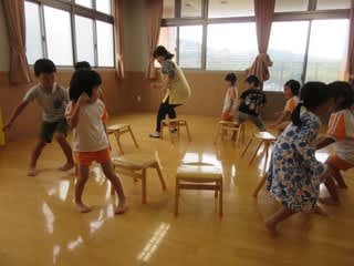 1階ホールで賑やかな声が聞こえてきましたが、3歳児~5歳児さんの椅子取りゲームで盛り上がっている声でした!