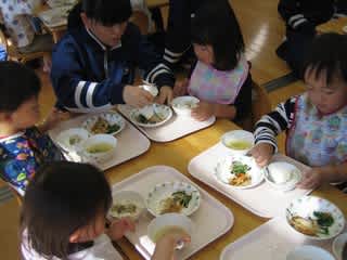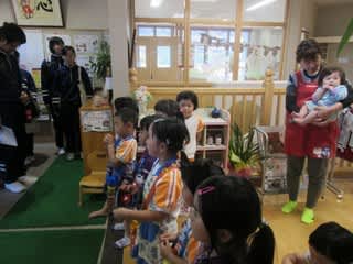 昨日に引き続き中学生の家庭科実習で賑わう保育園。