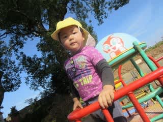芝生の山を滑り降りたり、輪っかの梯子に挑戦したりと大忙しの1歳児さん。