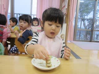 未満児さんの保育室を覗くと、、最後のひとつをぱくり♪