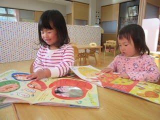 1歳児さんは、午睡から目覚めておやつまで絵本を読んで待ちました。