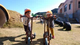 「よーいどん!」と、男の子2人はキックボードで芝山の周りをぐるぐると走ります。