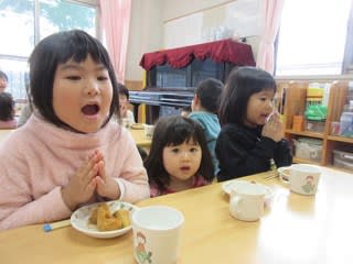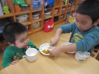今日は1〜5歳児みんな一緒におやつを食べました。