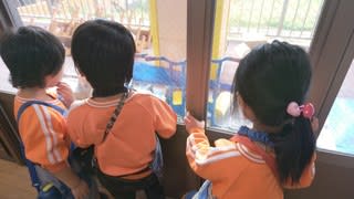 昼食の準備にランチルームへやってきた3.4歳児さん。