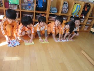 3・4・5歳児合同で、巧技台をしました。 BGMには太鼓の曲。 このリズムに合わせて跳んでいく人もたくさんいました 4歳児も負けてはいません 1人ずつ跳ぶのをしっかり見ながら 応援しています 体いっぱいのバネを使って ぴ…