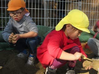 園庭では、砂に水を浸み込ませて、団子作りに精を出していましたよ。