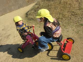 ぽかぽかの園庭では、三輪車やキックボードで遊ぶお友だち!