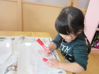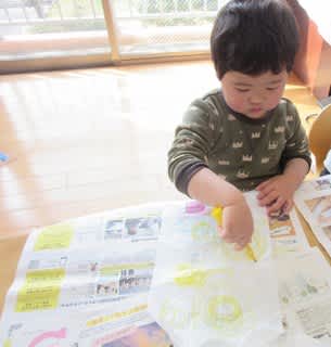 この日はビニール袋に、自分の好きな色を選んで「アンパンマン!」「ぐるぐる〜♬」とペンでお絵かきです。