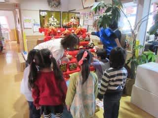 先日、保育園の絵本コーナーにお雛様が飾られました。