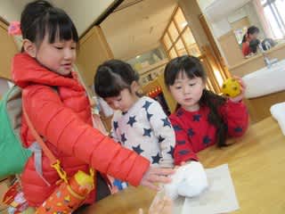 所によっては小雨が雪だったようで、登園の際に家族の車に積もっている雪を持って来てくれました(^^)