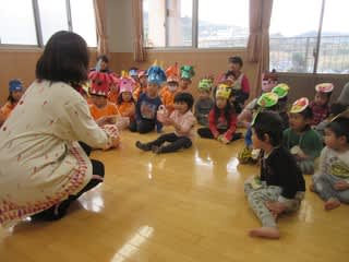 ペープサートでは、節分に必要な「いわし」「ひいらぎ」「まめ」がアイテムとして登場!