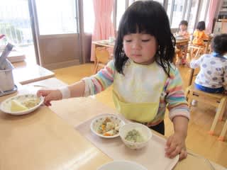 配膳台から自分の席へ、こぼさないようにそーっとそーっと…慎重に運ぶ姿をじーっと見守る保育士でした(^^)!