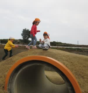 元気に園庭を走ったり、「先生、見とってね!」と芝山を軽々登ったりと体を動かしました(^^)